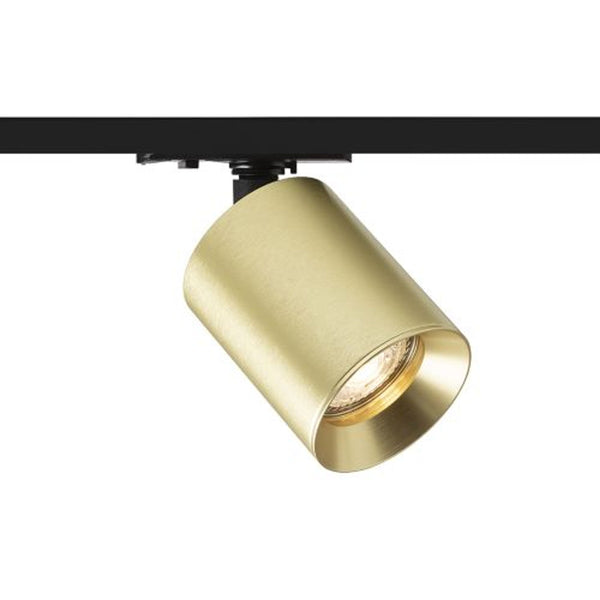 Минималистичен цилиндричен прожектор за светлинни източници GU10 за монофазни шини. Пружинното захващане на фасунгата позволява използването на светлинни източници с различна дължина.
