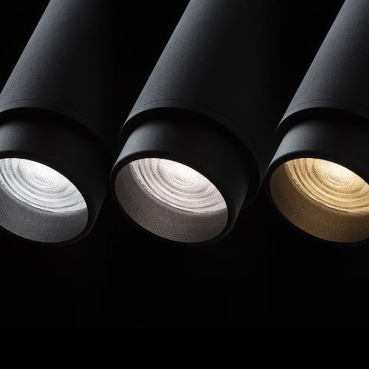 Минималистичен цилиндричен прожектор с фасунга GU10 за трифазни шини. Пружинното захващане на фасунгата позволява използването на светлинни източници с различна дължина.