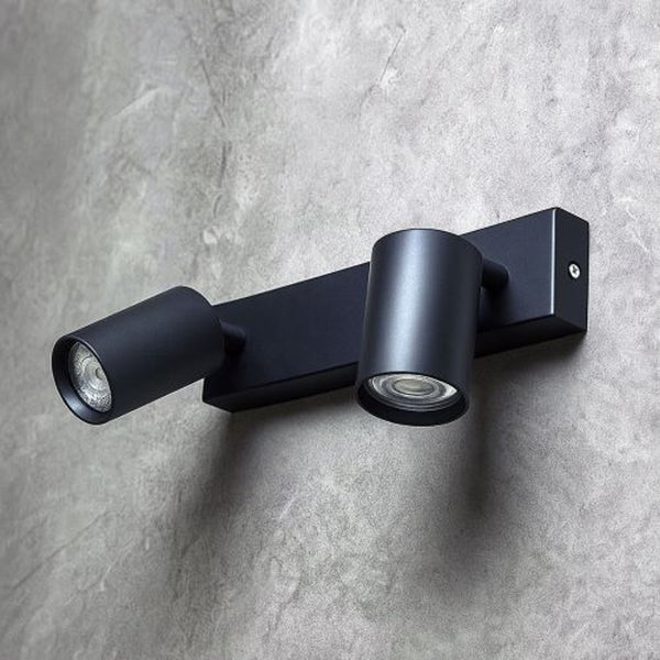 Стенна лампа с текстилен абажур и LED прожектор на огъваемо рамо. И двата източника на светлина могат да се управляват поотделно чрез превключватели в основата на лампата.