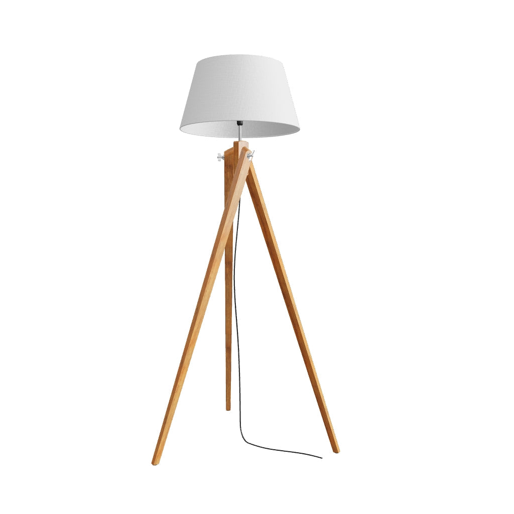 Стояща лампа с текстилен абажур и елегантна бамбукова основа. Подходяща за светодиодни източници на светлина с резба E27.