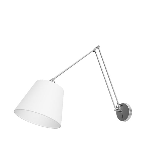 Стенна лампа с регулируемо рамо, текстилен абажур и ключ, разположен на основата.