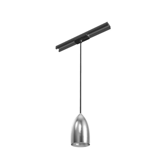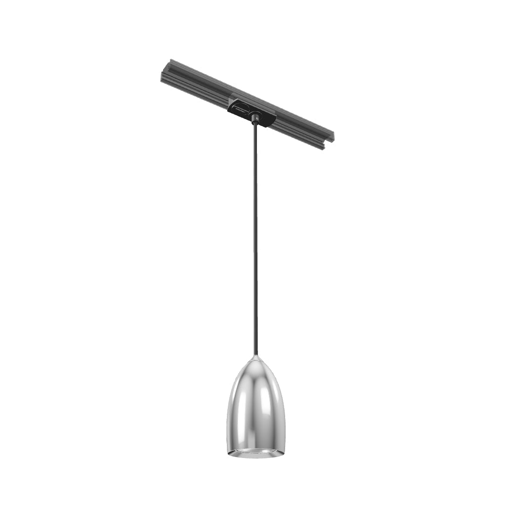 Висящо осветително тяло с абажур от хром или матиран никел, черен текстилен кабел и адаптер за монофазни шини.