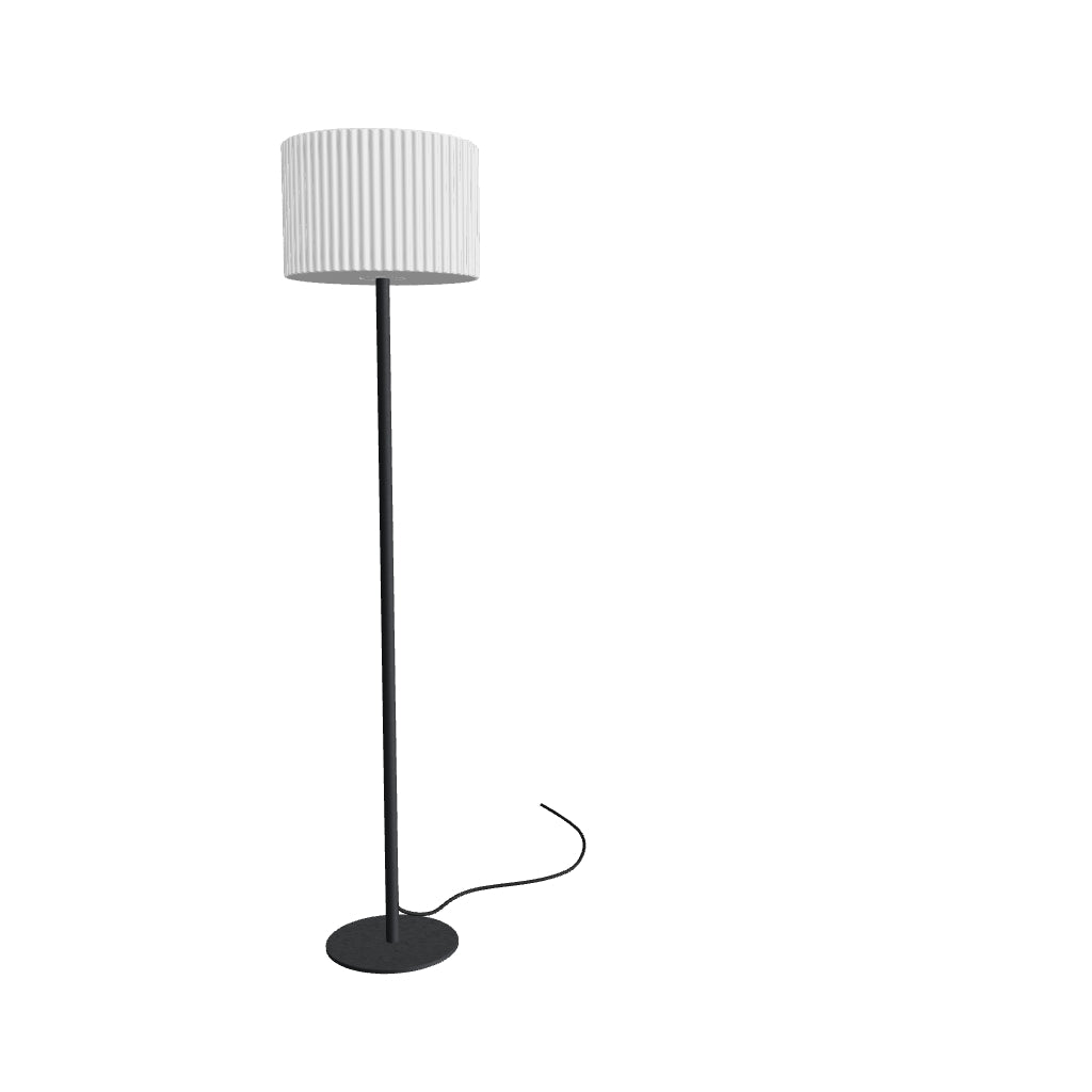 Външна подова лампа с пластмасов абажур. Кабелът е снабден с щепсел от съображения за безопасност.