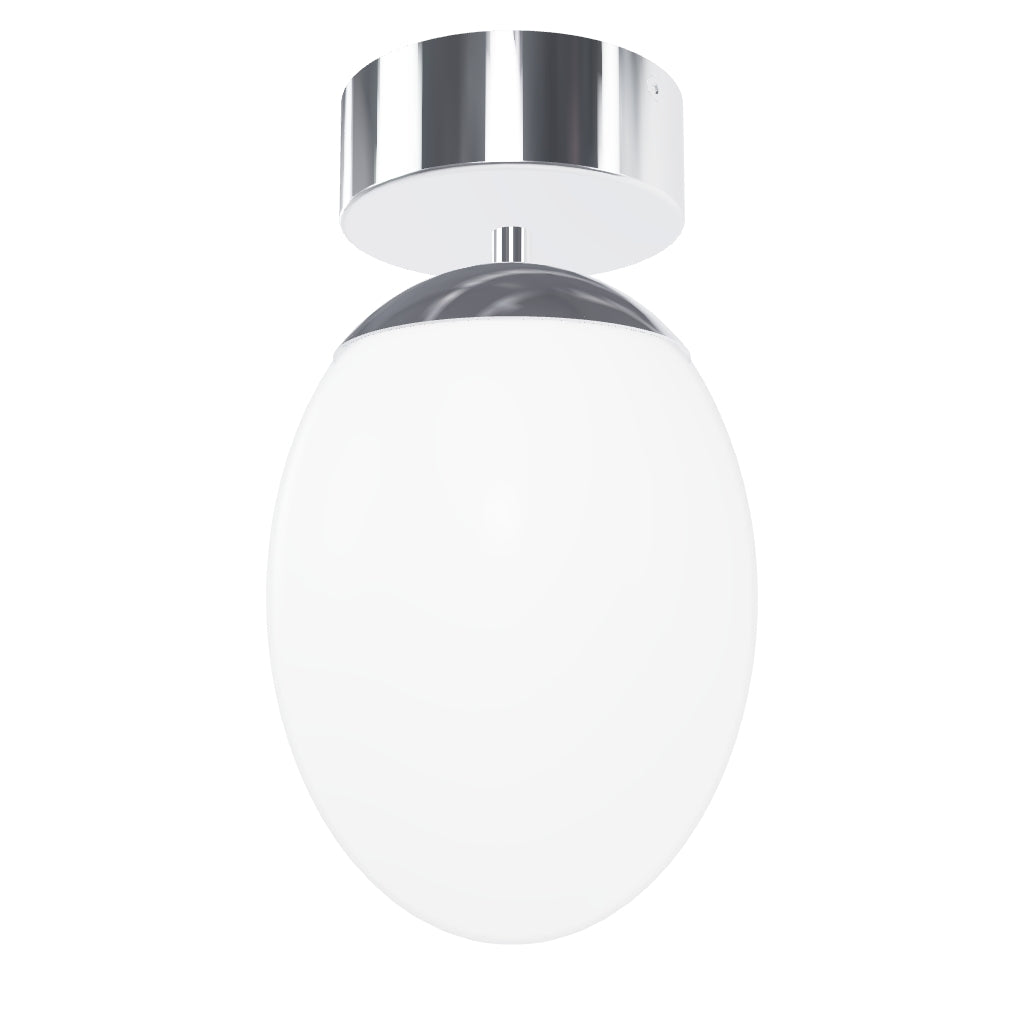 Овална стъклена таванна лампа с хромирана основа. Подходяща за използване в бани.