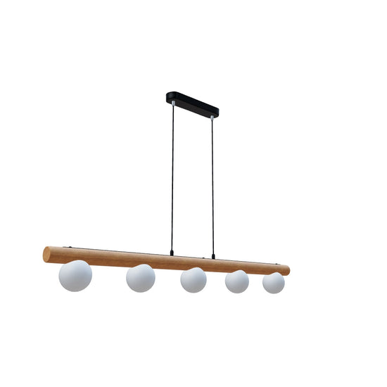 Осветително тяло тип пендел с пет опалови стъклени абажура, монтирани на дървена основа. Основата за таван е изработена от лакиран метал.