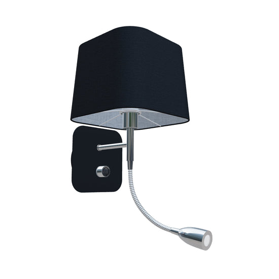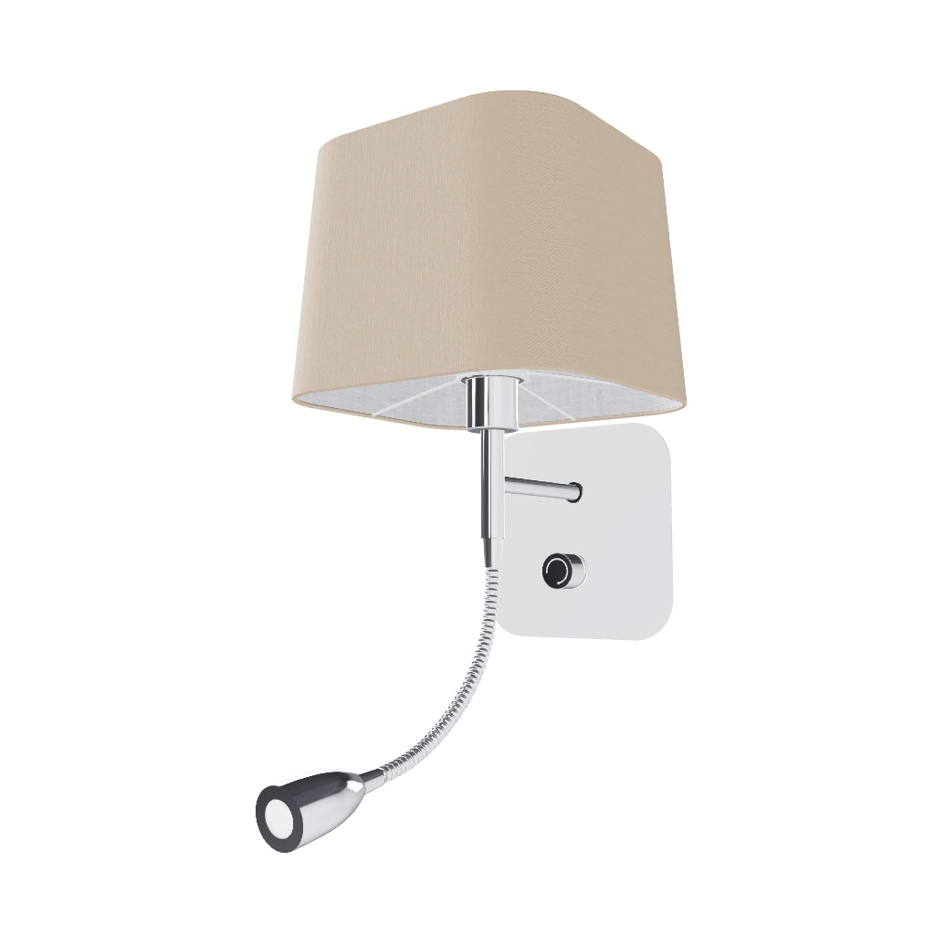 Стенна лампа с ъглов текстилен абажур и LED прожектор на гъвкаво рамо. Двата източника на светлина могат да се управляват индивидуално чрез въртящ се превключвател на ъгловата основа на лампата.