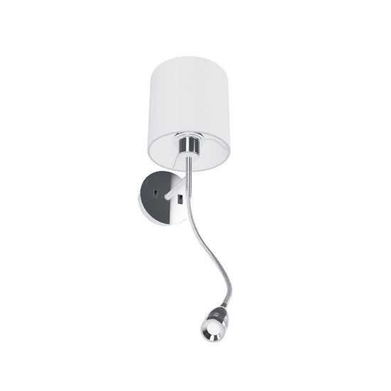 Стенна лампа с тектилен абажур и LED прожектор на огъваемо рамо. И двата източника на светлина могат да се управляват поотделно чрез превключватели, разположени на кръглата основа на лампата.